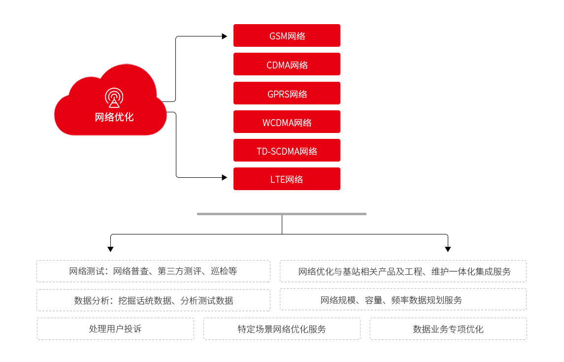 公司具有專業(yè)的網(wǎng)絡(luò)優(yōu)化分析團(tuán)隊(duì),具備多廠家、多運(yùn)營商的綜合性網(wǎng)絡(luò)優(yōu)化能力,針對GSM、CDMA、TD-SCOMA、WCDMA、LTE等多種制式的無線網(wǎng)絡(luò),提供整體的優(yōu)化解決方案,包括建網(wǎng)初期相后期擴(kuò)容工程的工程網(wǎng)絡(luò)優(yōu)化服務(wù)、運(yùn)維期間的日常網(wǎng)絡(luò)優(yōu)化服務(wù)、階段性分析解決網(wǎng)絡(luò)瓶頸的專項(xiàng)網(wǎng)絡(luò)優(yōu)化服務(wù),通過測試數(shù)據(jù)分析、話統(tǒng)數(shù)據(jù)分析,結(jié)合天饋線系統(tǒng)優(yōu)化、無線參數(shù)優(yōu)化話務(wù)均衡等方式,對網(wǎng)絡(luò)性能指標(biāo)進(jìn)行優(yōu)化提升,最終達(dá)到提高網(wǎng)絡(luò)質(zhì)量以滿足終端用戶需求及提升網(wǎng)絡(luò)設(shè)備利用率的效果。